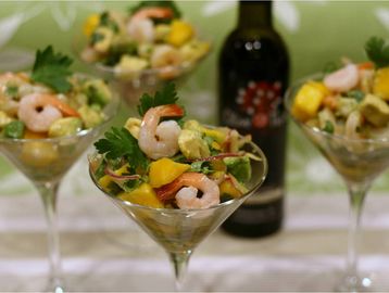 A refreshing appetizer featuring cooked shrimp, slice avocado, and a zesty sauce, tomato-based with lime, cilantro, and onion, served chilled in glasses.